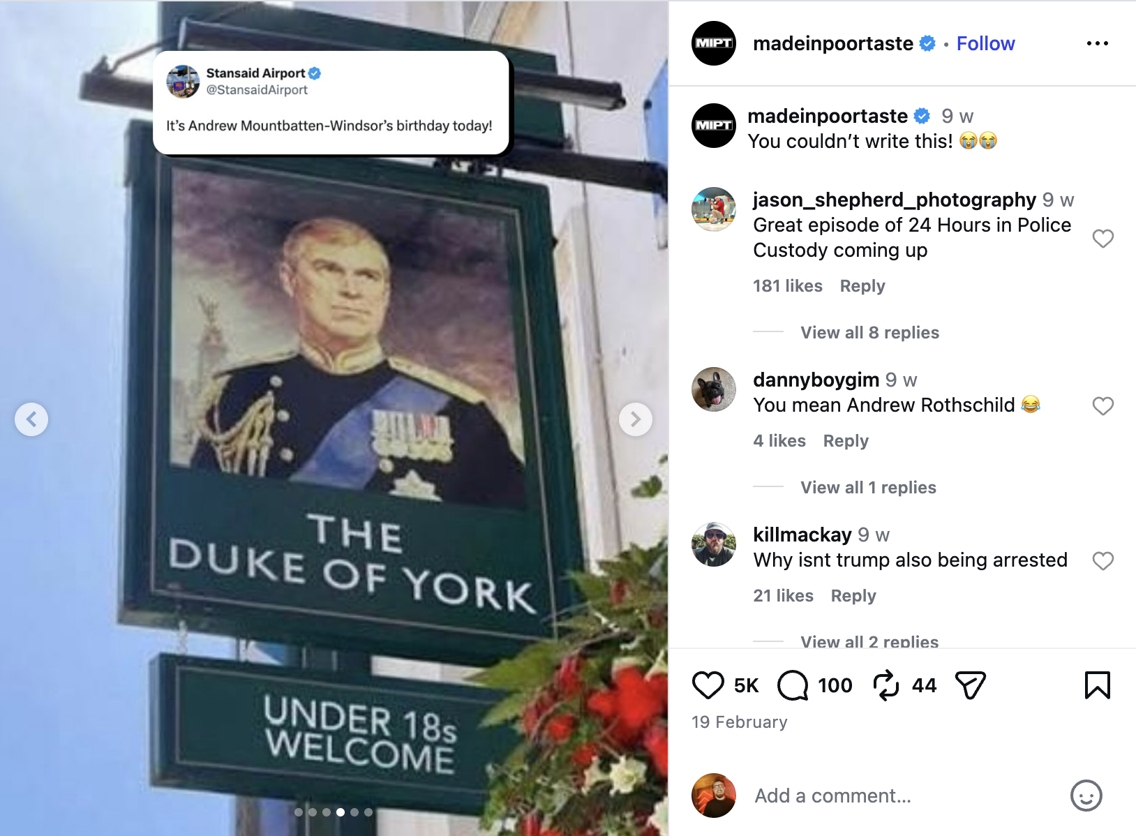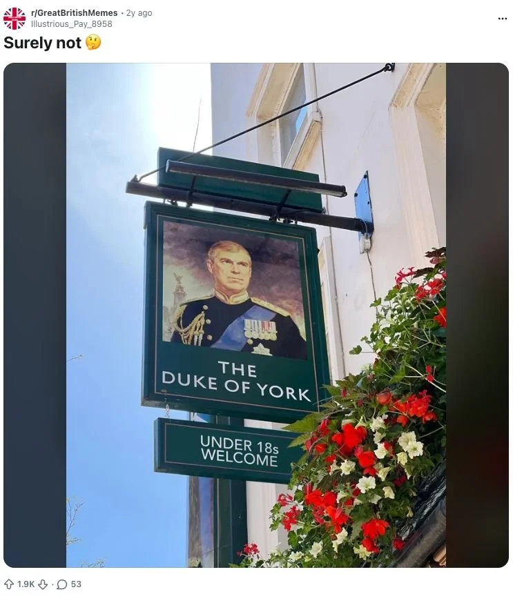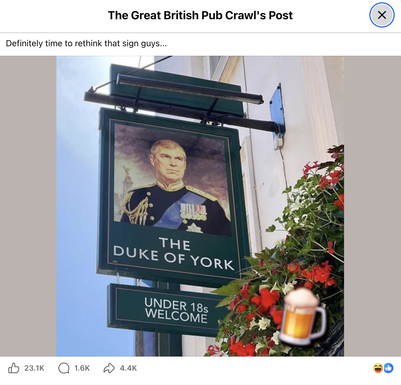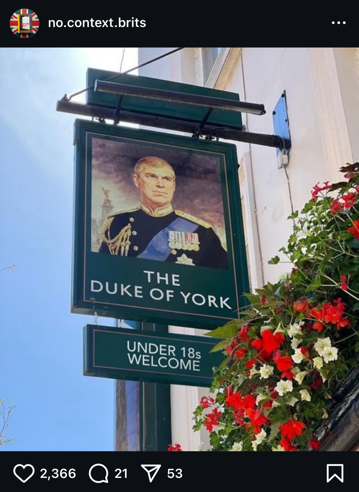 Our Thursday night local is one of many Duke of York pubs, but was the only one that still had Prince Andrew’s face on it.
